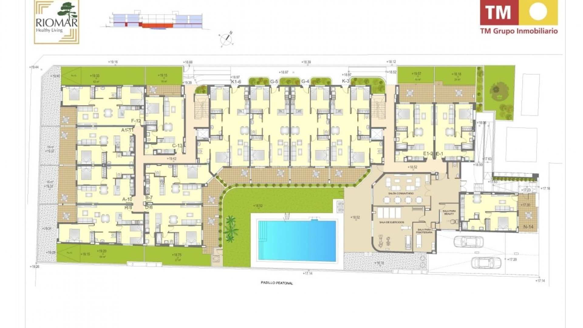Riomar Healthy Living vil disponere totalt 46 leiligheter med 1 eller 2 soverom og spektakulære fellesarealer med: svømmebasseng, heis, fullt utstyrt treningsrom, fellesrom, spa-avdeling og fysioterapirom.